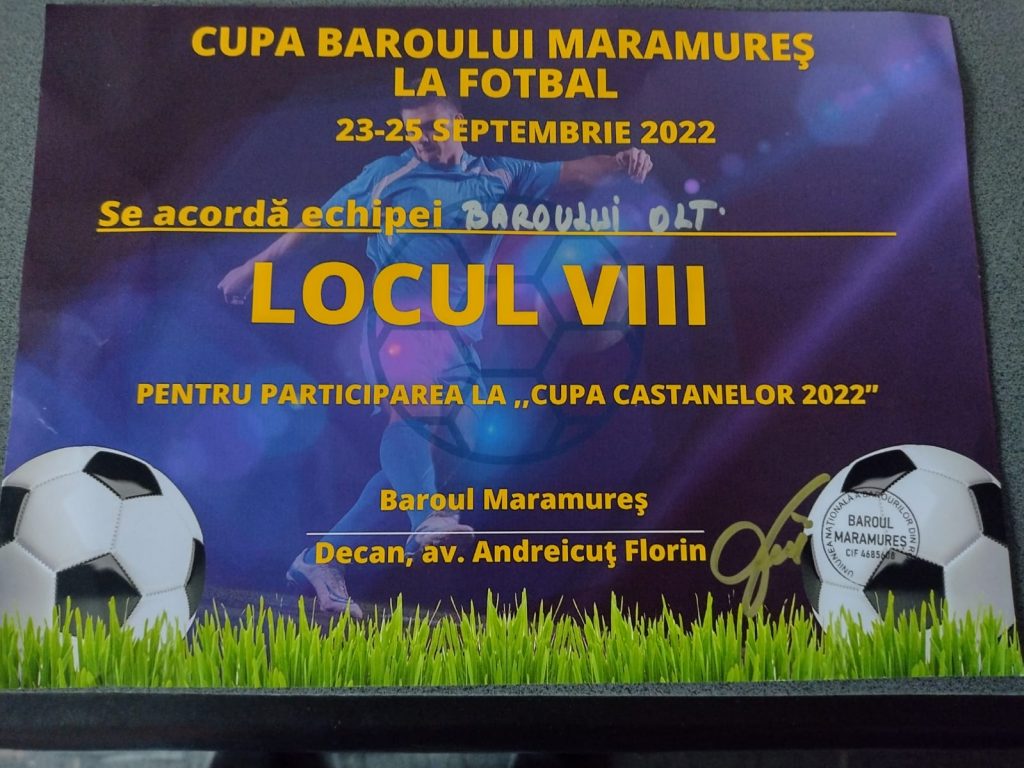 Echipa de fotbal a Baroului Olt a participat la Baia-Mare, în perioada 22-25 septembrie, la un nou turneu din Campionatul Național de Fotbal al Avocaților, denumit “Cupa Castanelor 2022”. Băieții noștri au ocupat un onorabil loc 8, dintr-un total de 24 de echipe participante. Am atașat rezultatele echipei de fotbal. Mulțumim băieților pentru participare, pentru dăruirea de care au dat dovada și le uram succes în continuare!